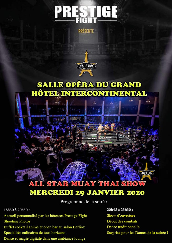 Aussi, son fameux show All Star s’est produit plusieurs fois au sein d’un lieu éblouissant, dans la fastueuse Salle Opéra du Grand Hôtel Intercontinental. En plein cœur de Paris, la Salle Opéra du Grand Hôtel est située à deux pas du monument historique mondialement célèbre « l’Opéra Garnier ». Un show de Muay Thai de luxe !