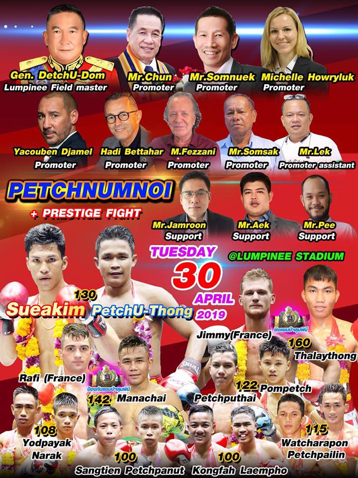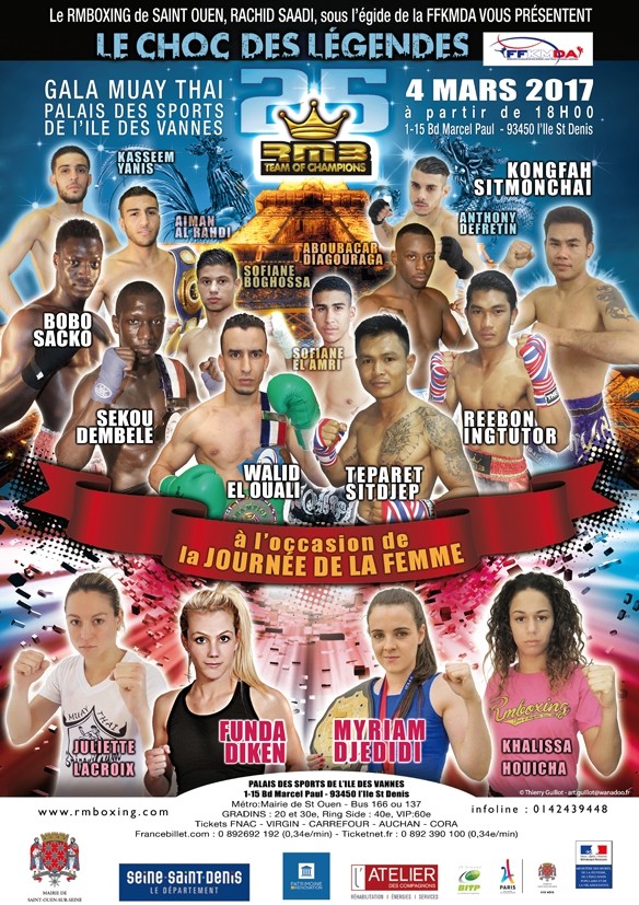 Les promoteurs français ont réussi le pari d’organiser des combats pour les titres de ces prestigieux stadiums, notamment avec les ceintures du Radja, Youssef Boughanem contre Kompetchlek Lookprabat, victoire de Youssef Boughanem, Azize Hlali contre Manaowan Sitsongpeenong, victoire de Manaowan, Anthony Defretin contre Phonek Naiponkon, victoire de Phonek, Fabio Pinca contre Manaowan Sitsongpeenong, victoire de Fabio Pinca. Ainsi qu’une ceinture du Lumpinee avec Rafi Bohic contre Dylan Salvador, victoire de Rafi Bohic.