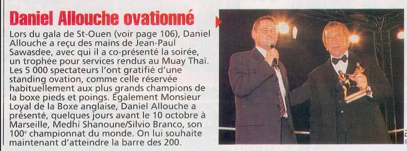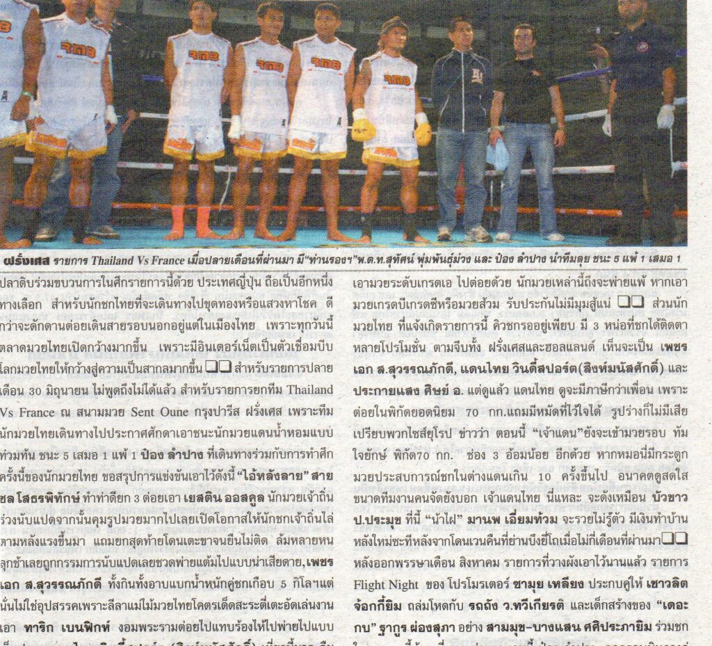 La même année, Denis Marie Cintura a organisé un combat pour une ceinture du Lumpinee en France, ainsi qu’un championnat au mythique stadium du Radja à Bangkok. En octobre, Saiyok Pumpanmuang a défendu avec succès son titre du Lumpinee à Paris en battant le champion Abdellah Mabel. Quelques semaines plus tard, en novembre, au stadium du Radja, Mickael Piscitello s’est incliné aux points face à Chanachai Kaewsamrit pour le titre en – 70 kg.